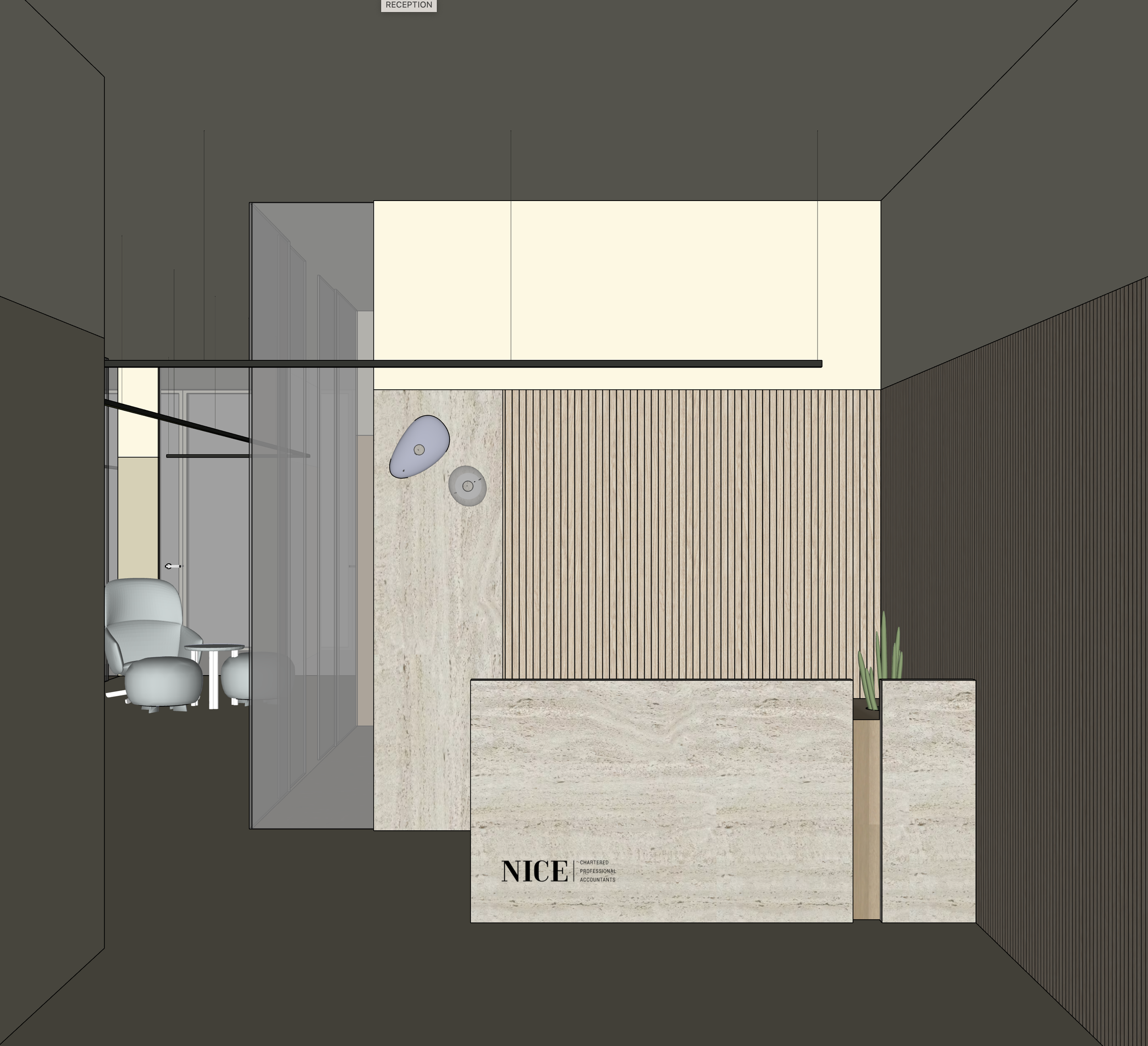 Material Palette Exploring the intersection of materials and forms, the stone inspired by the natural travertine look elevates the entrance space, providing a bright and lightweight feel. The reception desk is featured with a slatted wood texture and an accent wall sconce.
