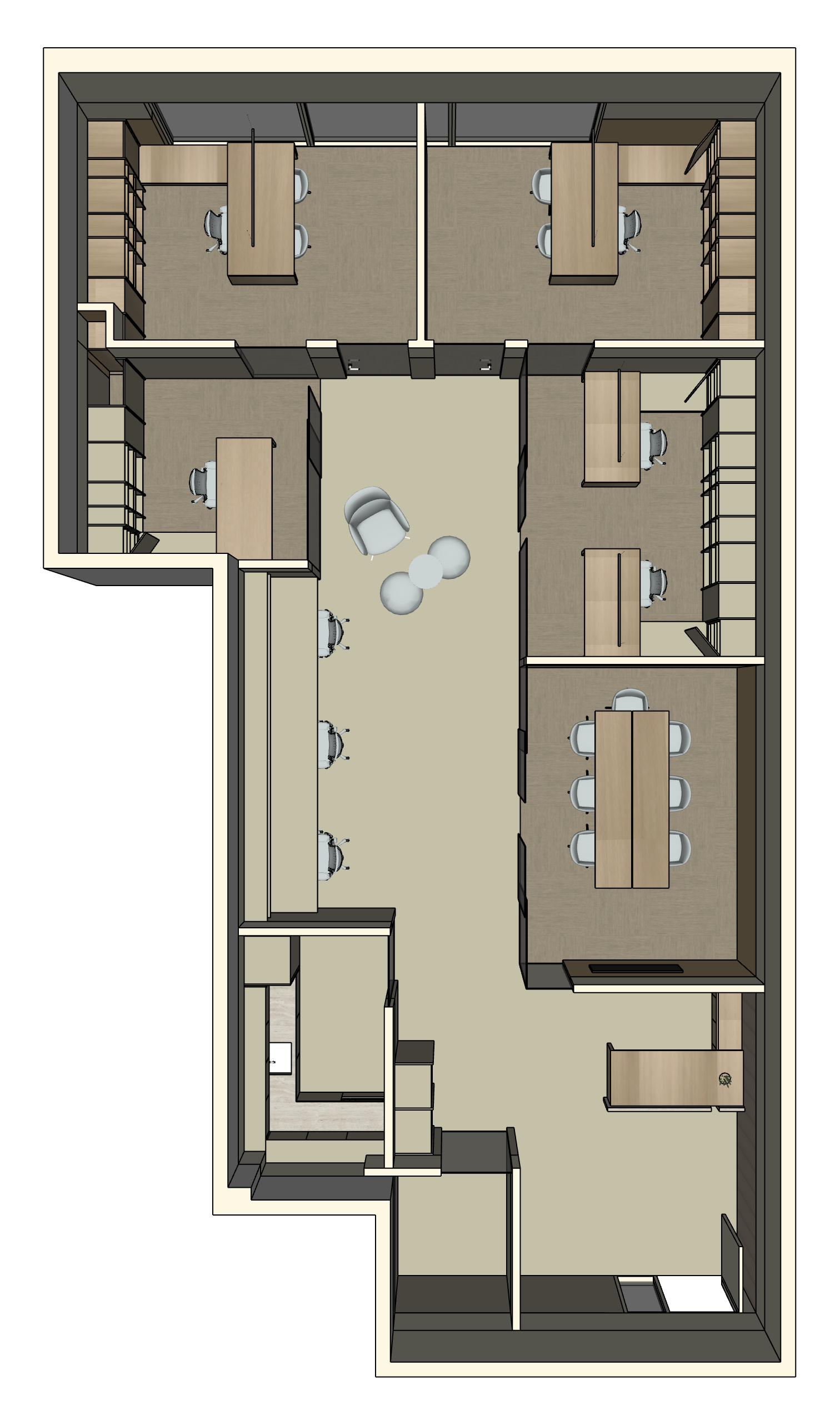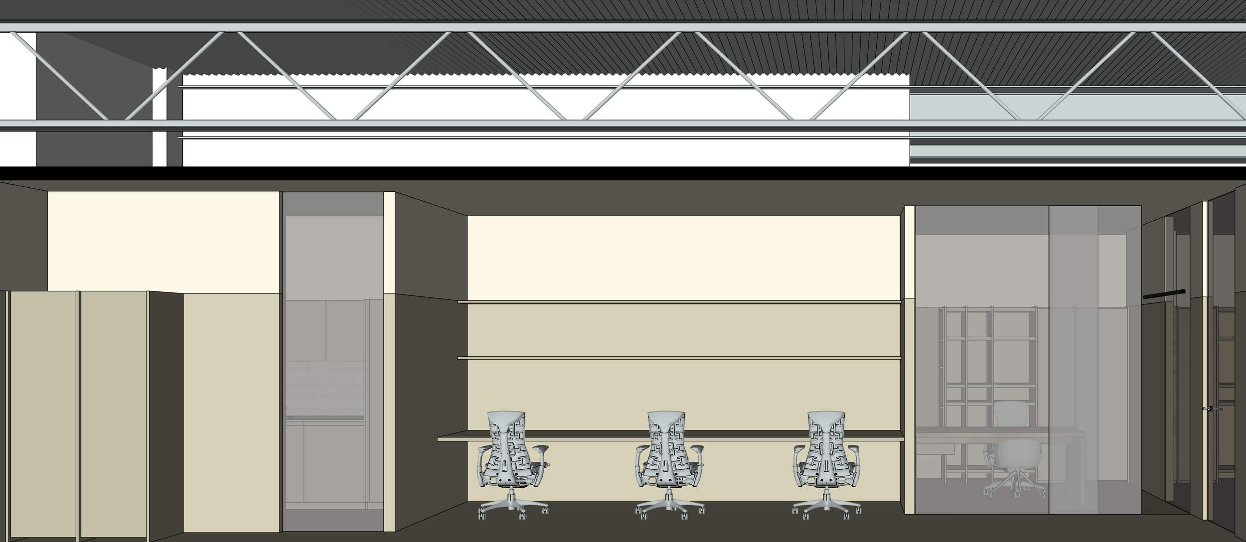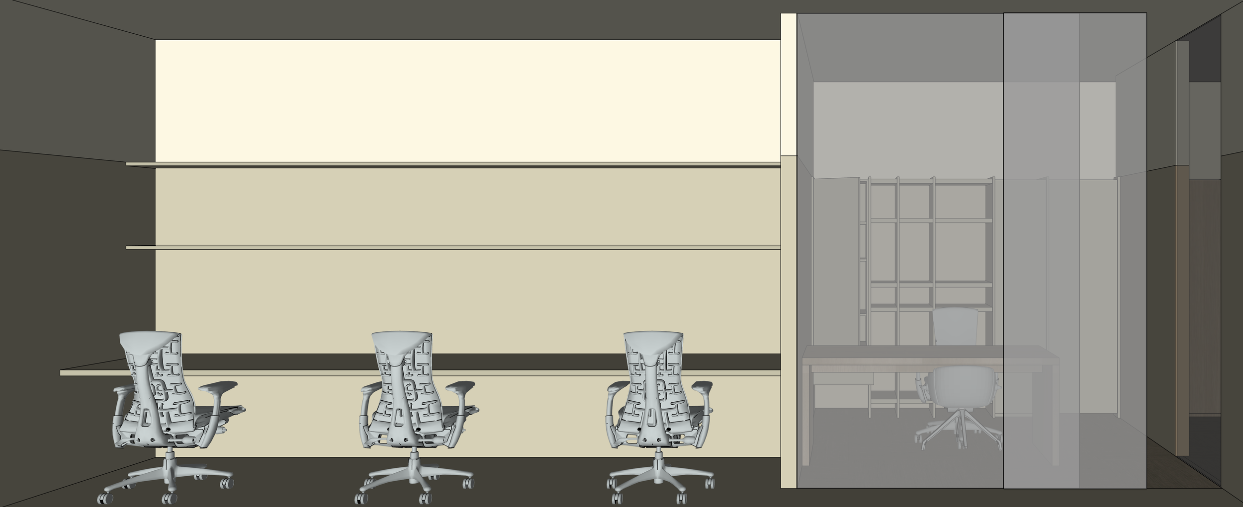 Paint Variation Concept, material selection, and interior elevations are centered around the concept of spatial linearity and the arrangement of elements using a distinct palette of paint colors to define these elements. This playful visual contrast within the interior environment establishes a strong foundation for having focused conversations, collaborations, and care for client and employee relationships.