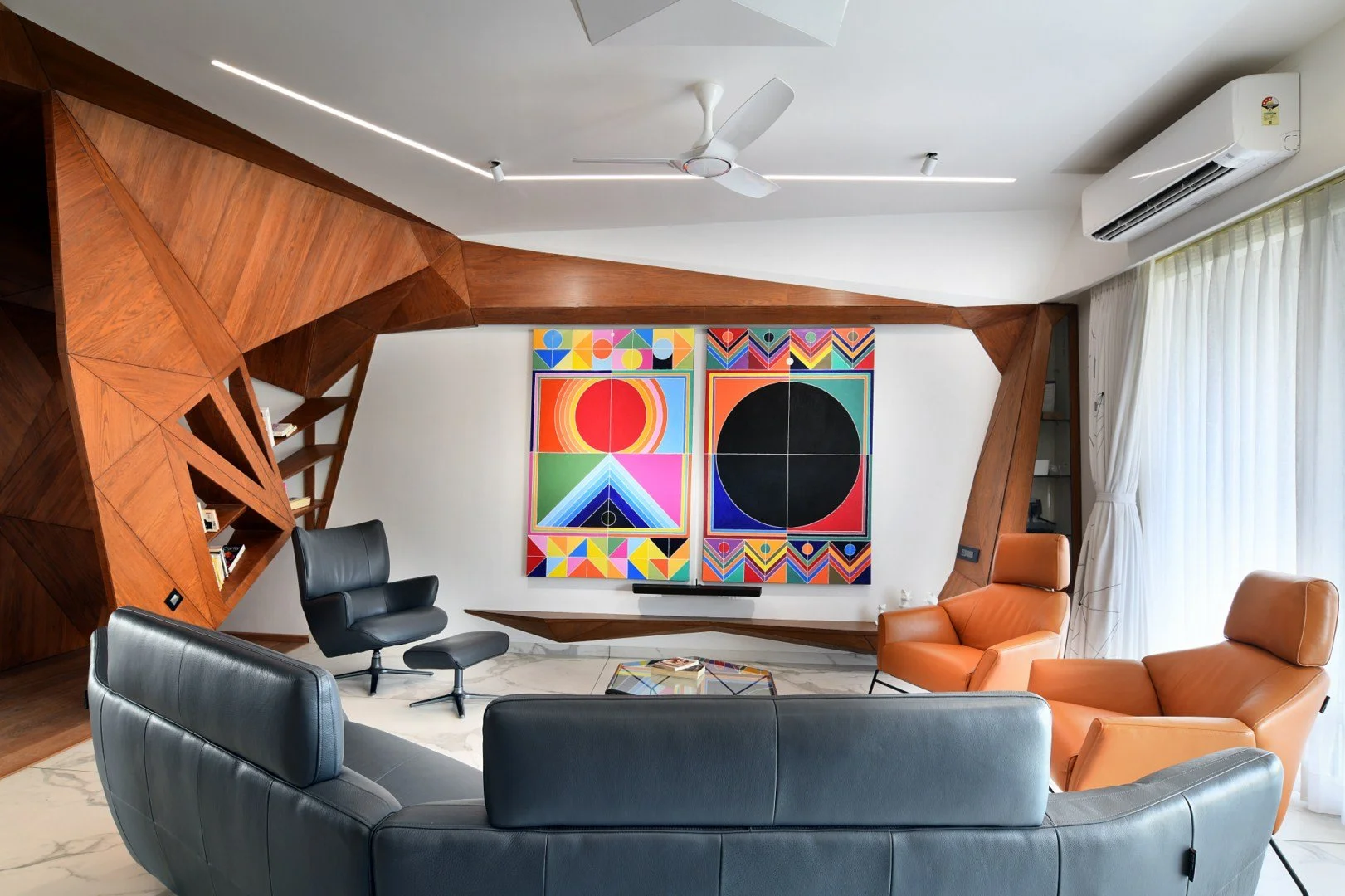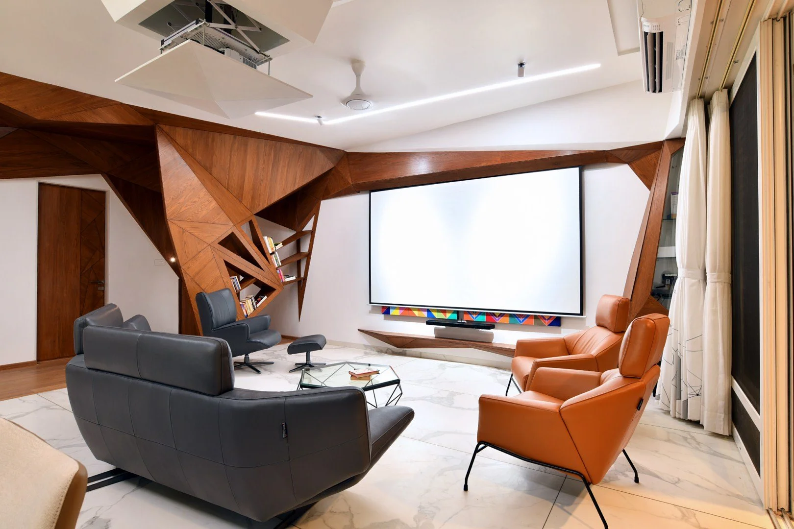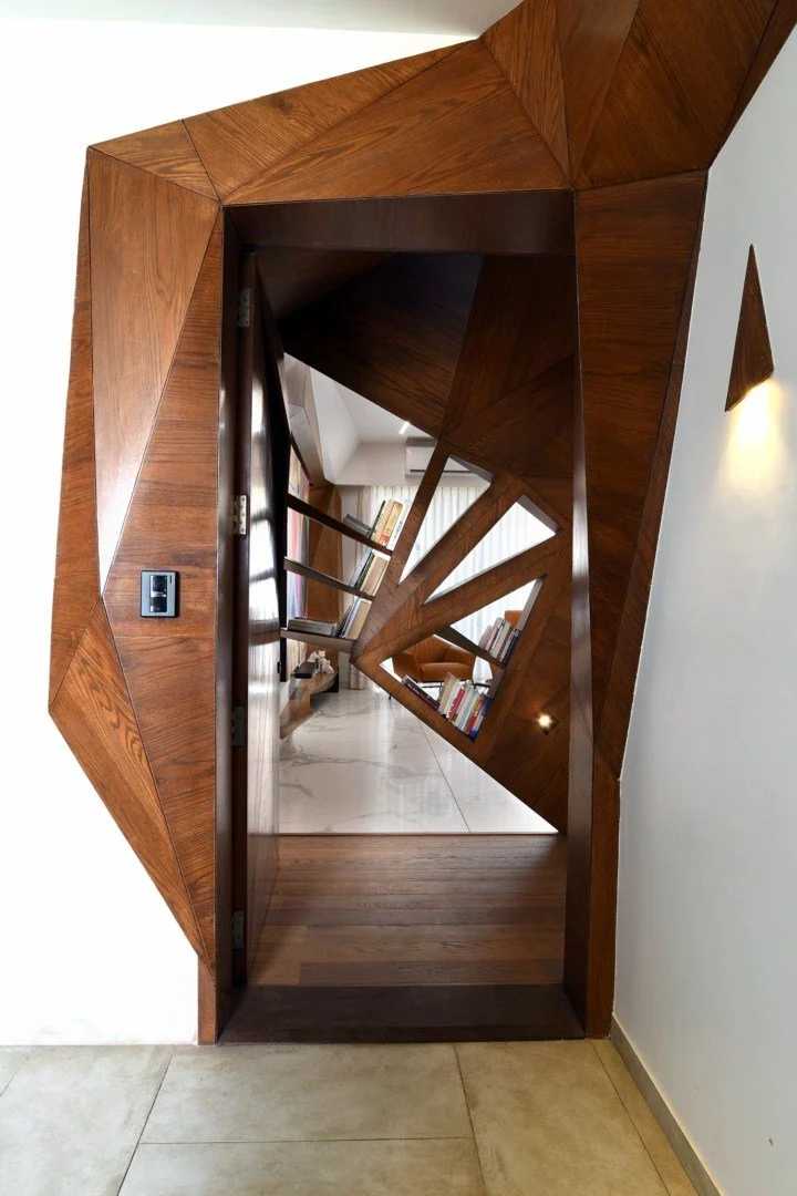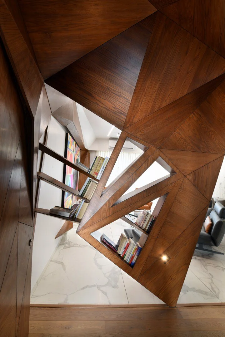 In the Bhagwat Home project, we took this exploration to another level by employing systems of triangulation, creating a design that was both aesthetic and functional. The triangulation extended beyond the physical environment and structural rigidity, ultimately manifesting as an endless field of physical and visual engagement. The generative design utilized various triangular sizes to form a shell-patterned skin that thematically unified the spaces and accentuated the sculptural qualities of the design.