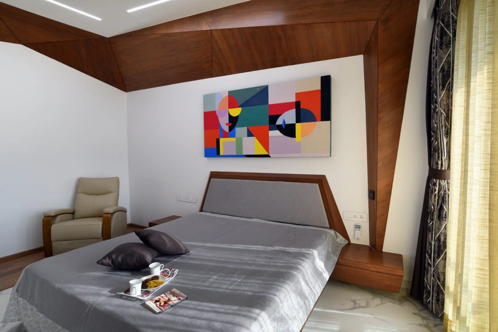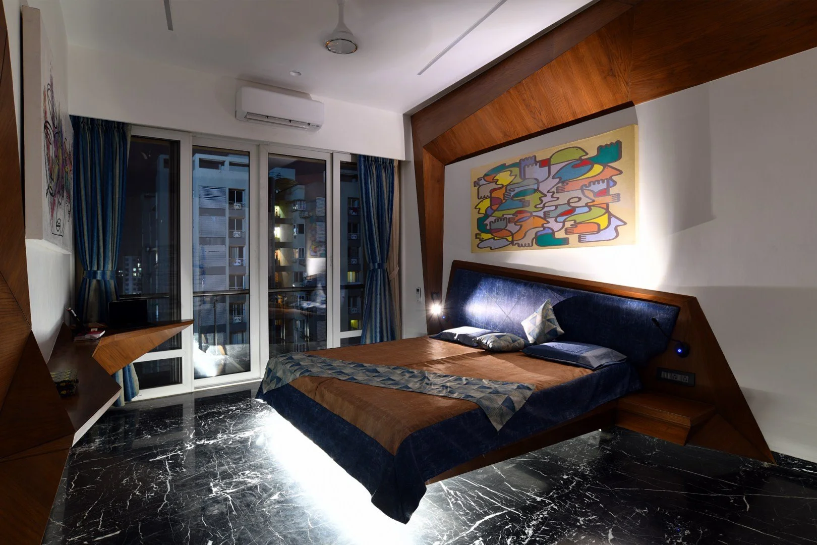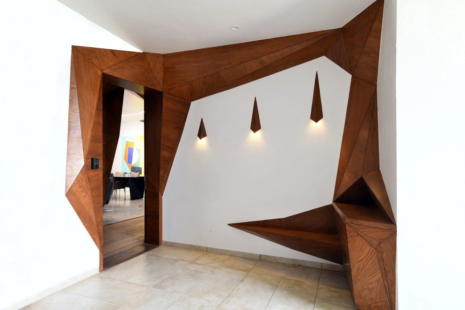 In the Bhagwat Home project, we took this exploration to another level by employing systems of triangulation, creating a design that was both aesthetic and functional. The triangulation extended beyond the physical environment and structural rigidity, ultimately manifesting as an endless field of physical and visual engagement. The generative design utilized various triangular sizes to form a shell-patterned skin that thematically unified the spaces and accentuated the sculptural qualities of the design.