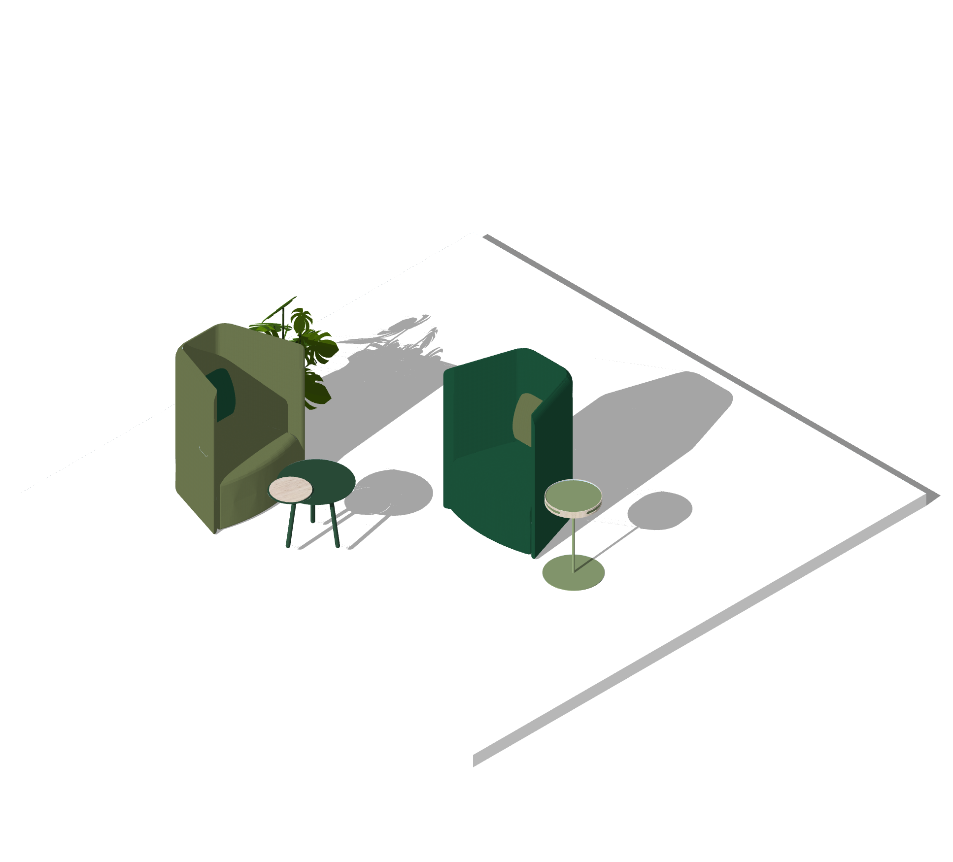 Shaping spaces and designing experiences for a luncheon area in a workspace design and build project, the geometry of the tables introduces formal elements while breaking continuity to allow for more open and breathable spaces.